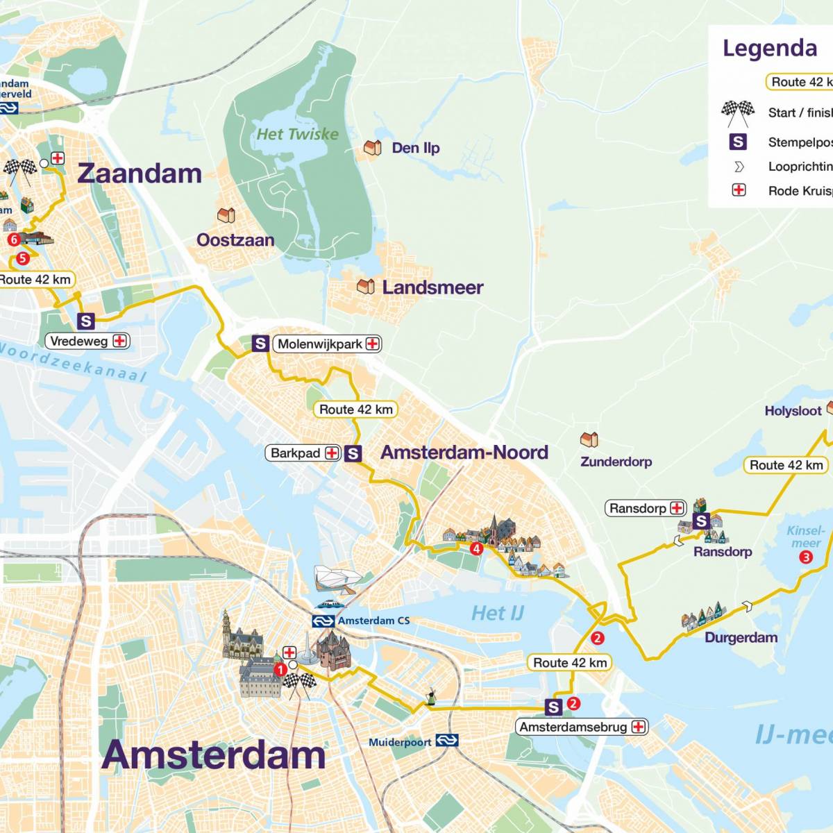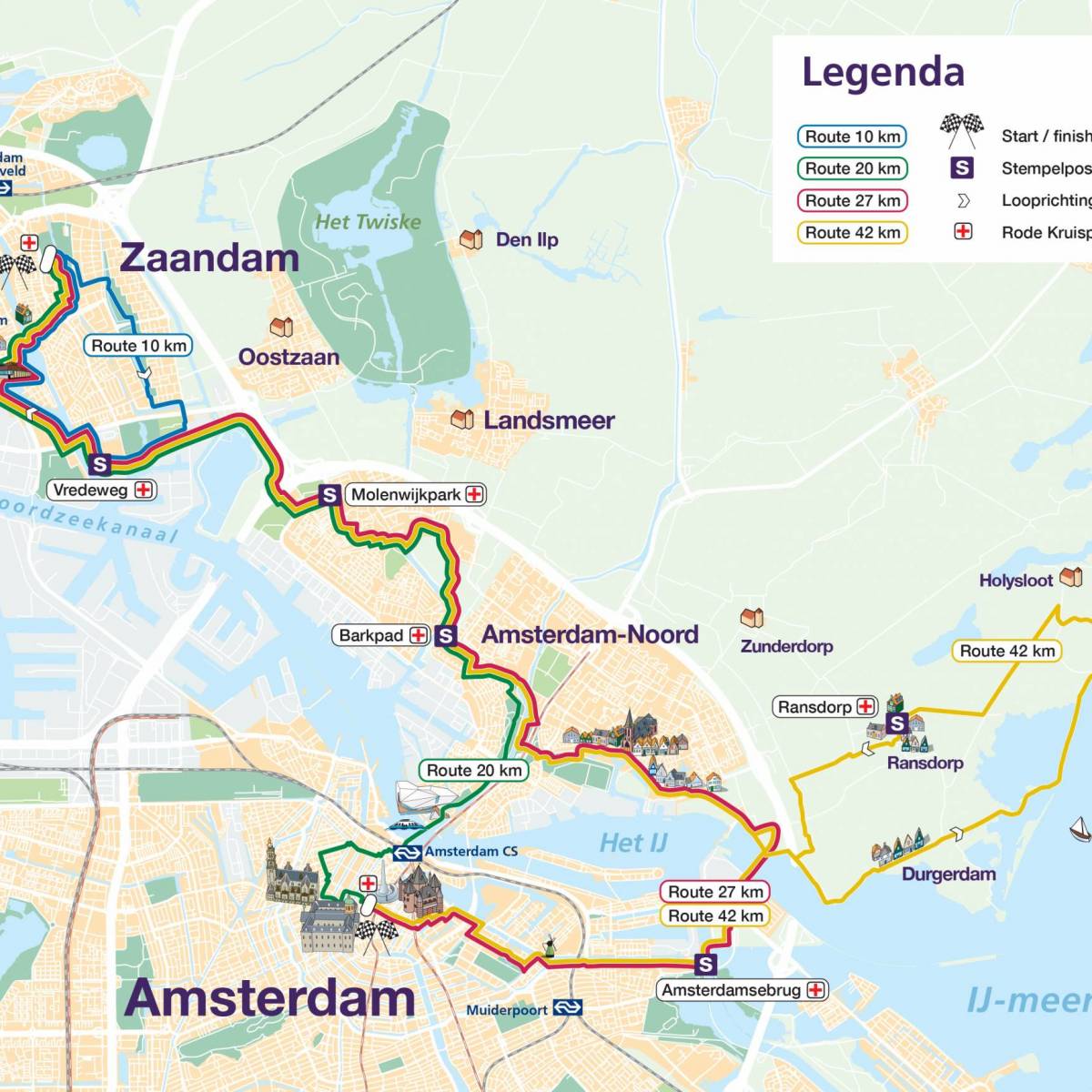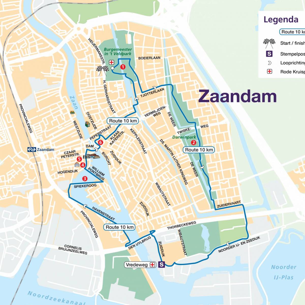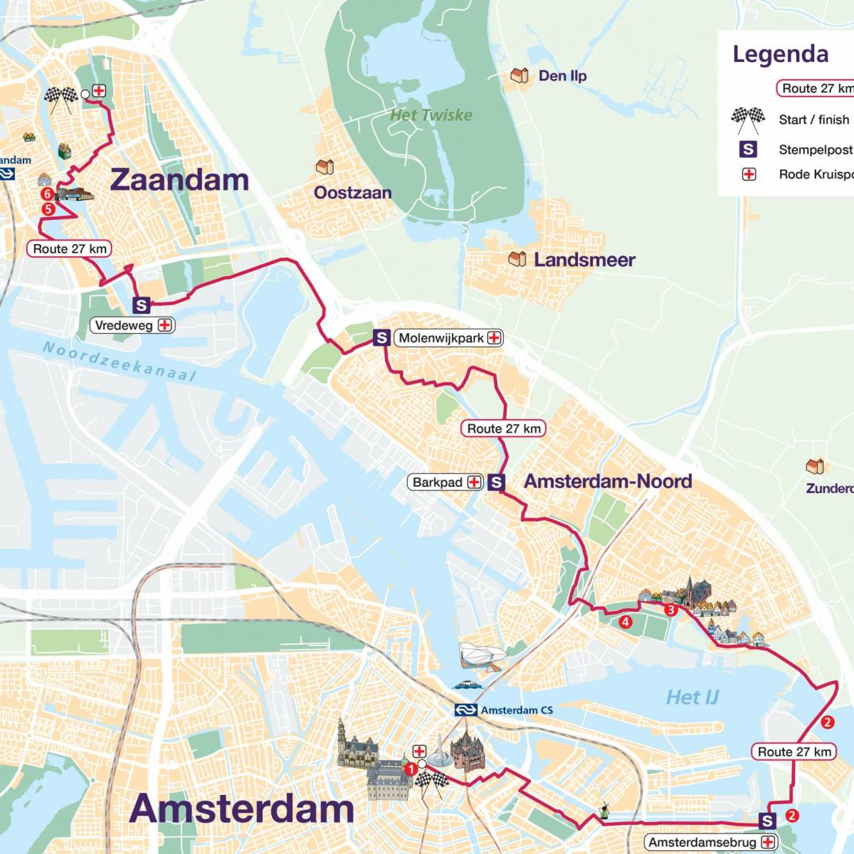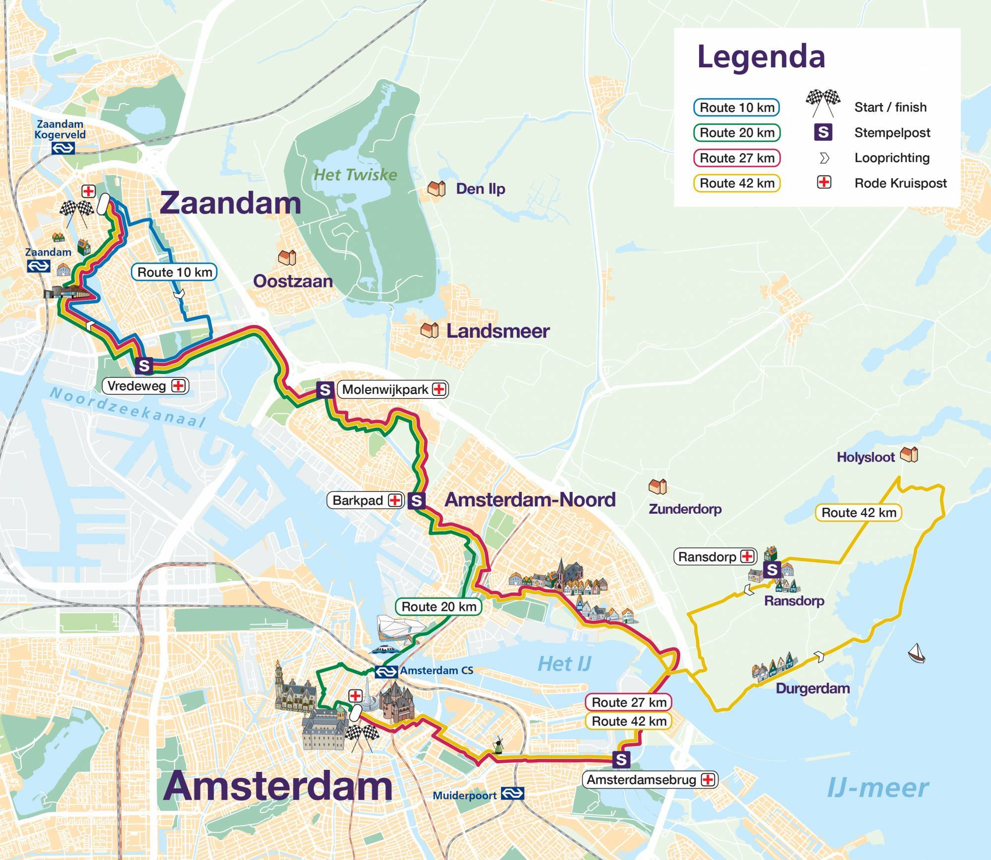 You start at the Dam tot Dam Park in Zaandam. From there you walk to Darwin Park via the Panneroodstraat. The southern part of the Darwin Park is dedicated to nature and education. Here you’ll find a school garden complex, the petting zoo Darwin Park and Nature Museum E. Heimans. In addition, along the North-South Path there are four theme gardens (woodland garden, marsh garden, grass garden and water garden) with artworks, designed by Kees Bierman. After this you continue to the Noorder IJ- en Zeedijk, where the route connects to the route of the 20, 27 and 42 km hikers. You walk the route with them via the port of Zaandam and along the Zaan. Shortly before the finish, all participants can deviate from the route for a while to visit the Czaar Peterhuisje. The finish is in the Dam tot Dam Park in Zaandam, where you’ll be welcomed with music.